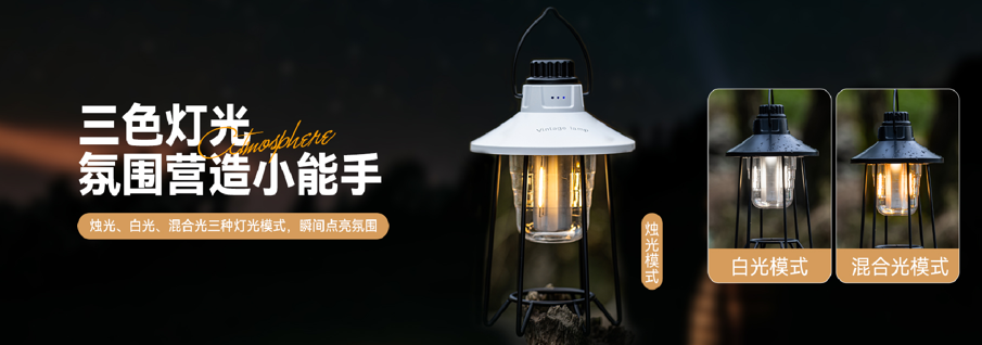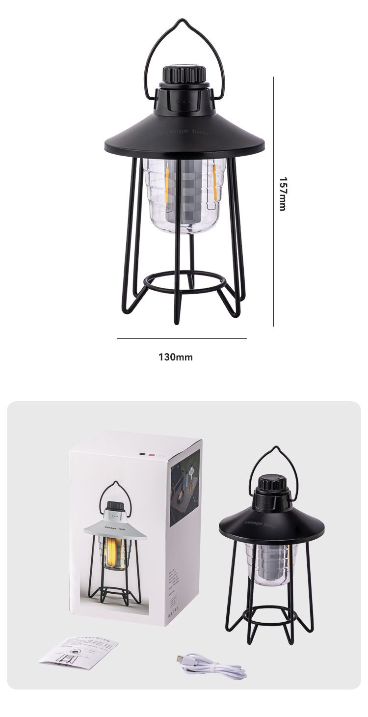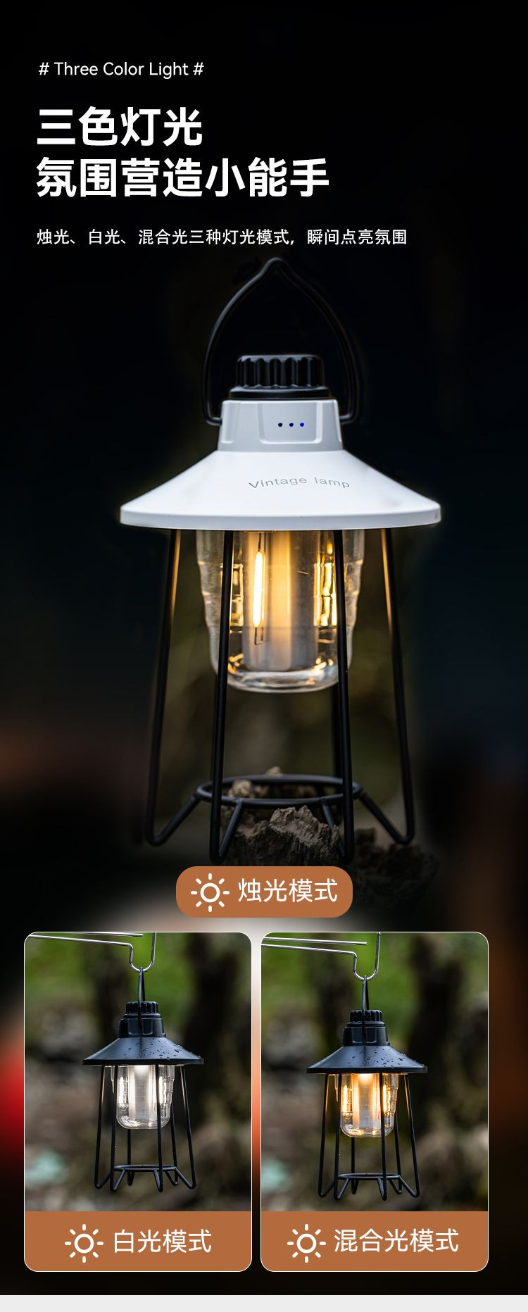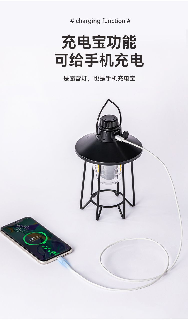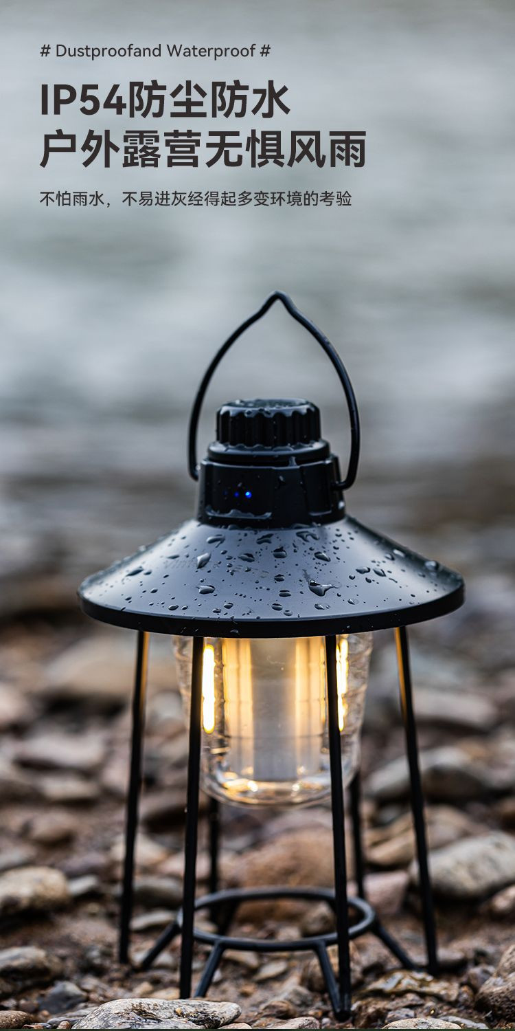 Soft ambient lighting; ABS + PC material with iron craftsmanship; 3 faux tungsten filament bulbs + 9 LEDs; stepless dimming with a rotary knob to highlight premium quality. Built-in intelligent chip with red emergency SOS rescue function. Daily-life water resistant, equipped with power bank functionality, with a battery life of 2–60 hours.