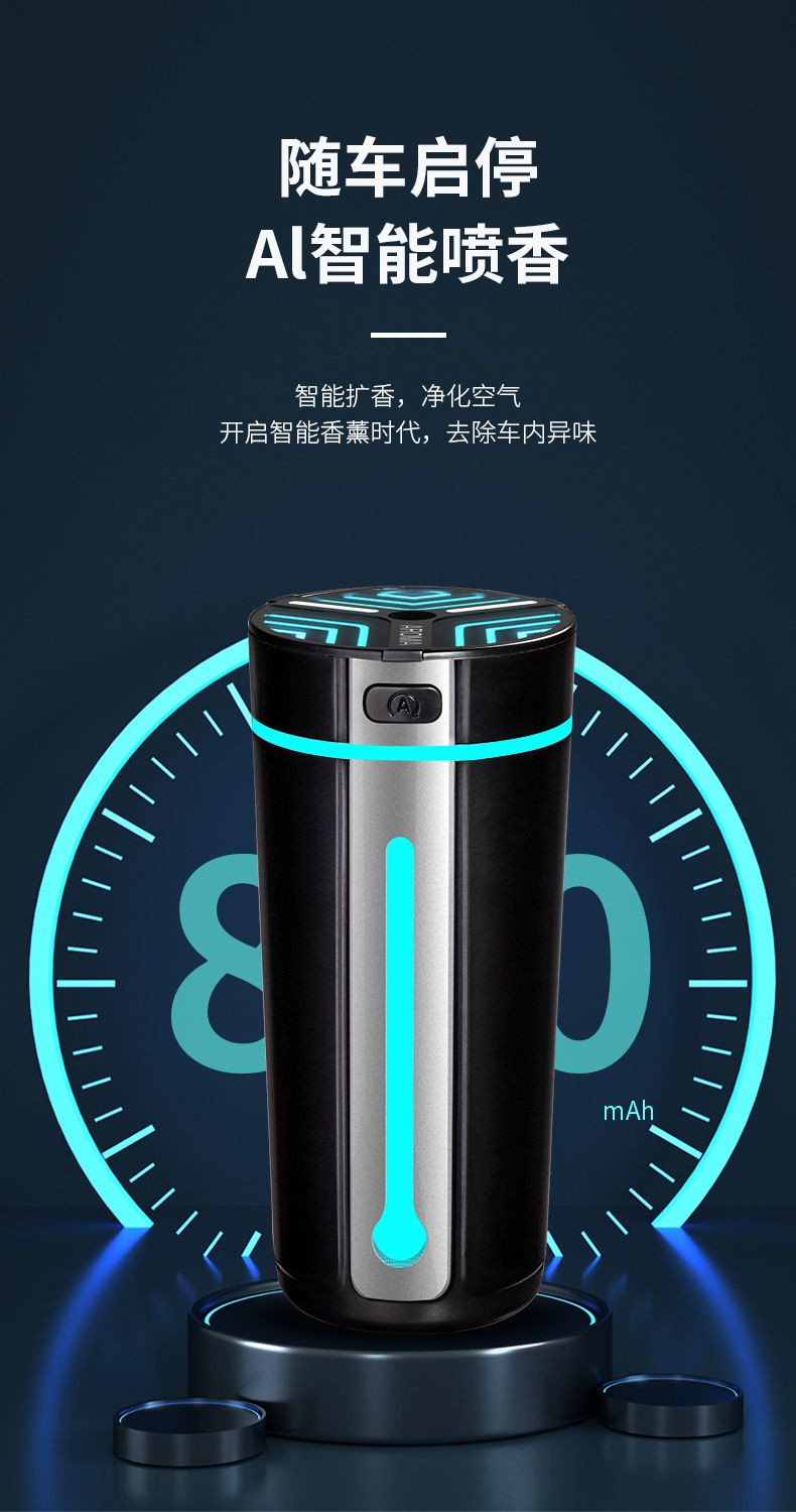Press the power button briefly again to switch to the car’s light fragrance mode. The mist will spray for 5 seconds, then pause for 10 seconds. When misting, the breathing light will turn on; when not misting, the lights will turn off. The device will enter sleep mode after 5 minutes of parking, and the auto start/stop mode will resume after detecting vibration.