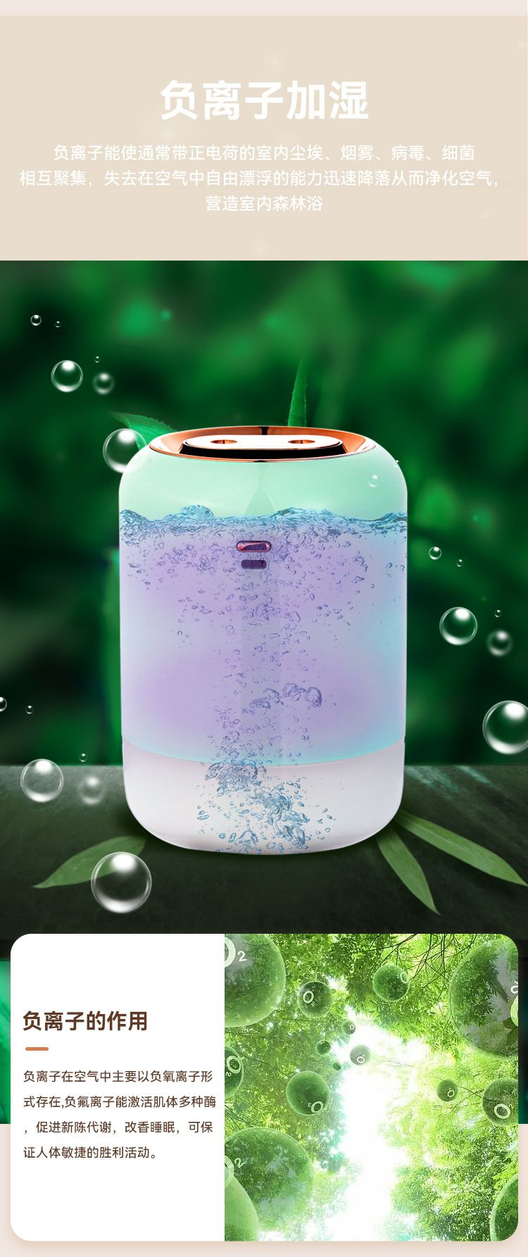 The negative ions can gather dust particles with positive charges in the air, purifying the indoor air.