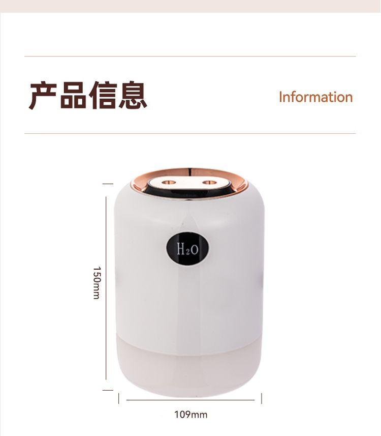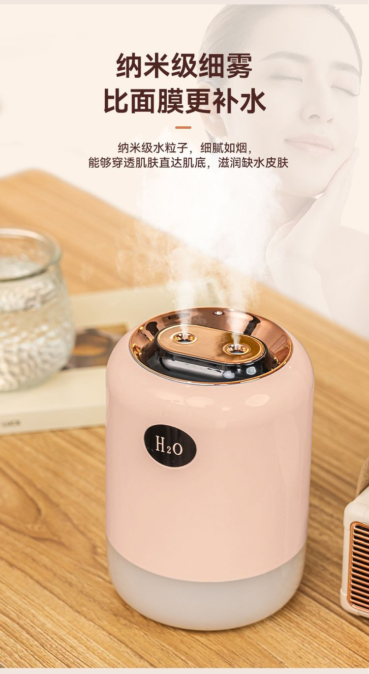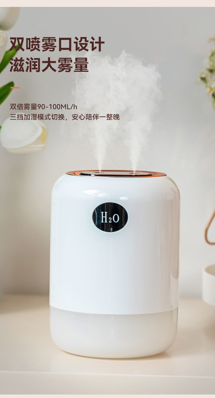 1. Long press the button for 3 seconds to activate the dual-spray continuous misting mode, with the tank light turning on and the light set to a seven-color gradient mode.