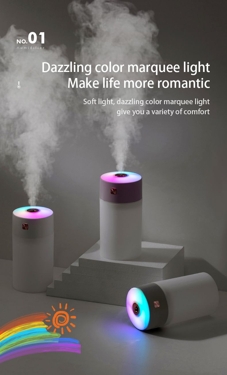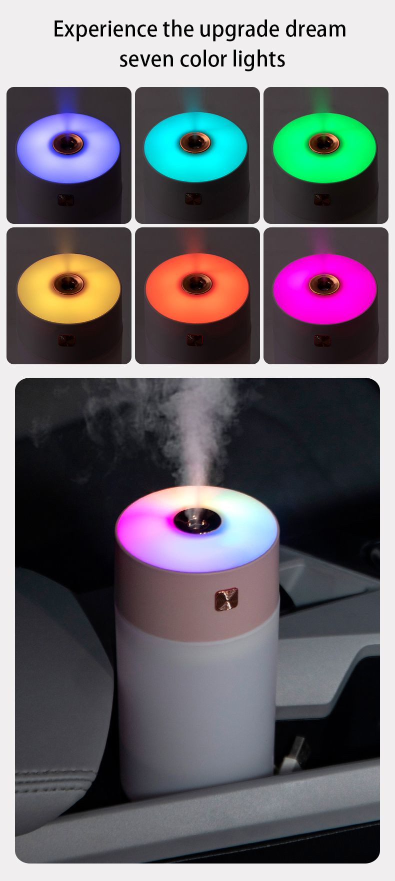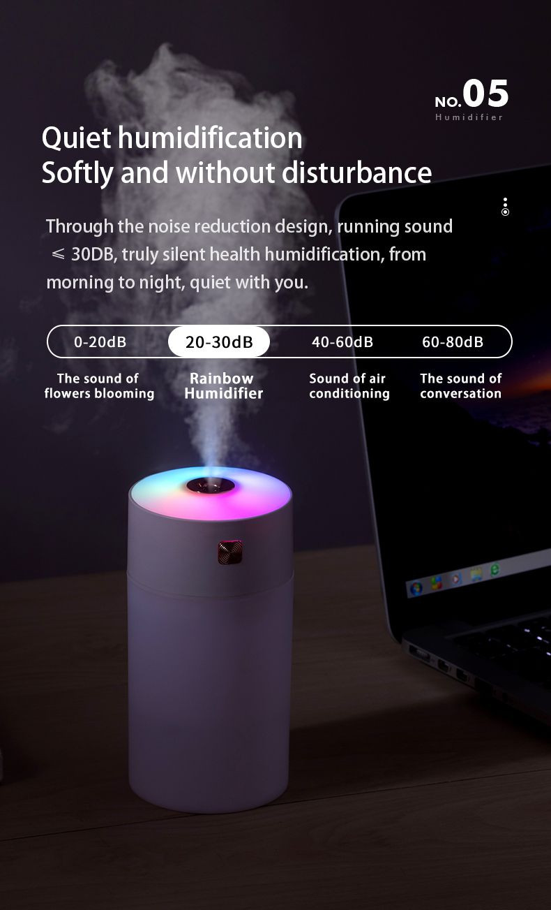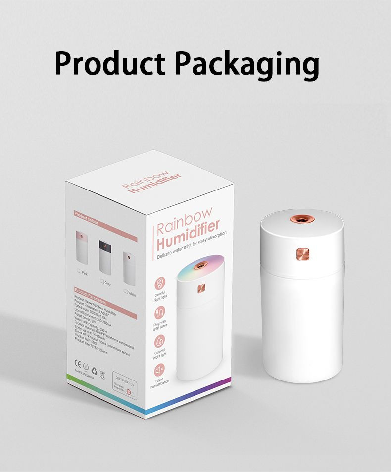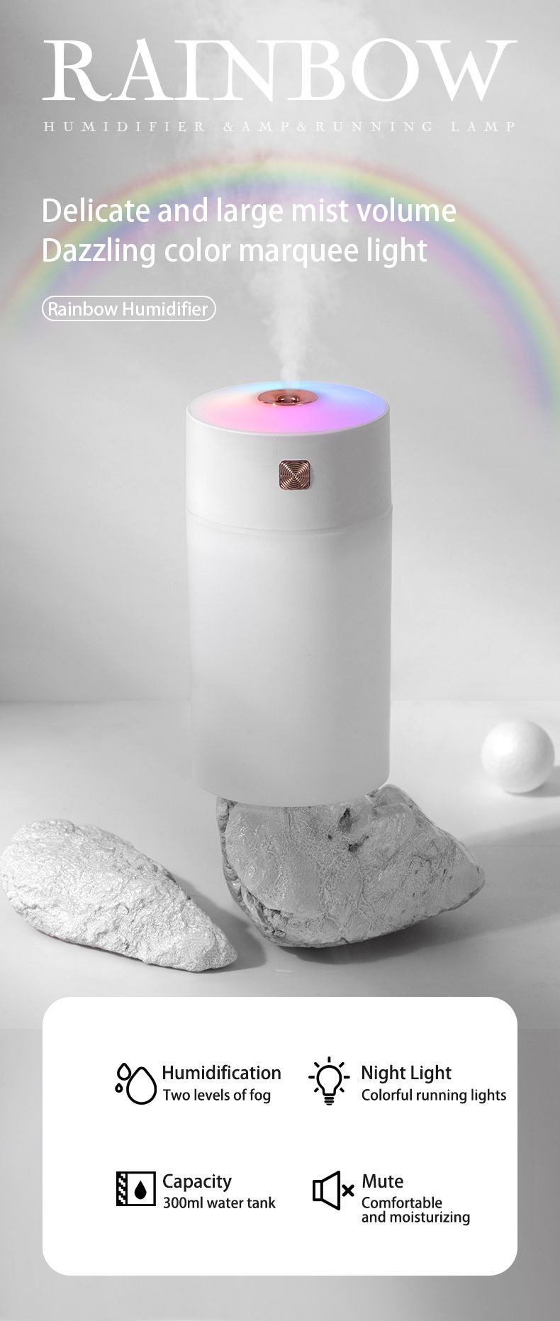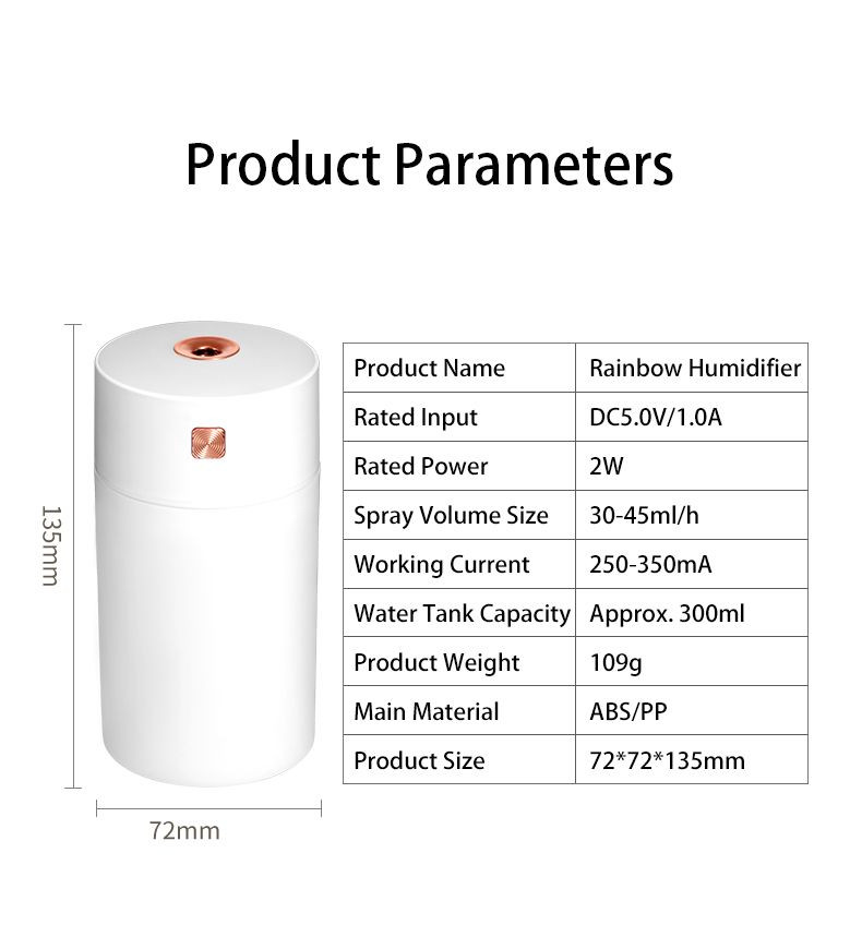 Rainbow Humidifier with 7 color ambient lighting and marquee light function. The noise-reduction design provides silent humidification, with sound levels between 20-30dB during operation. It features a 300ml large water tank with an anti-bacterial design. Two modes are available: 4-hour continuous misting and 6-hour intermittent misting. Compact and convenient, it supports both desktop and car use, improving humidification by 70% in the car. It also has an automatic power-off after 6 hours for safety and convenience.