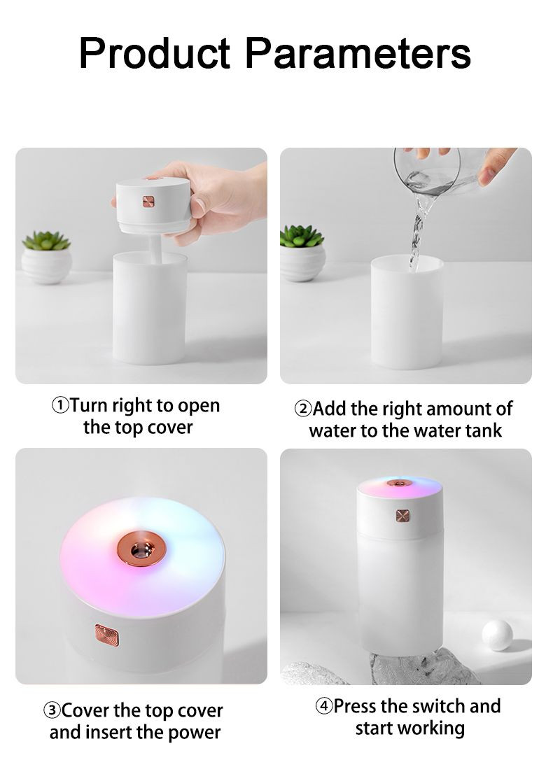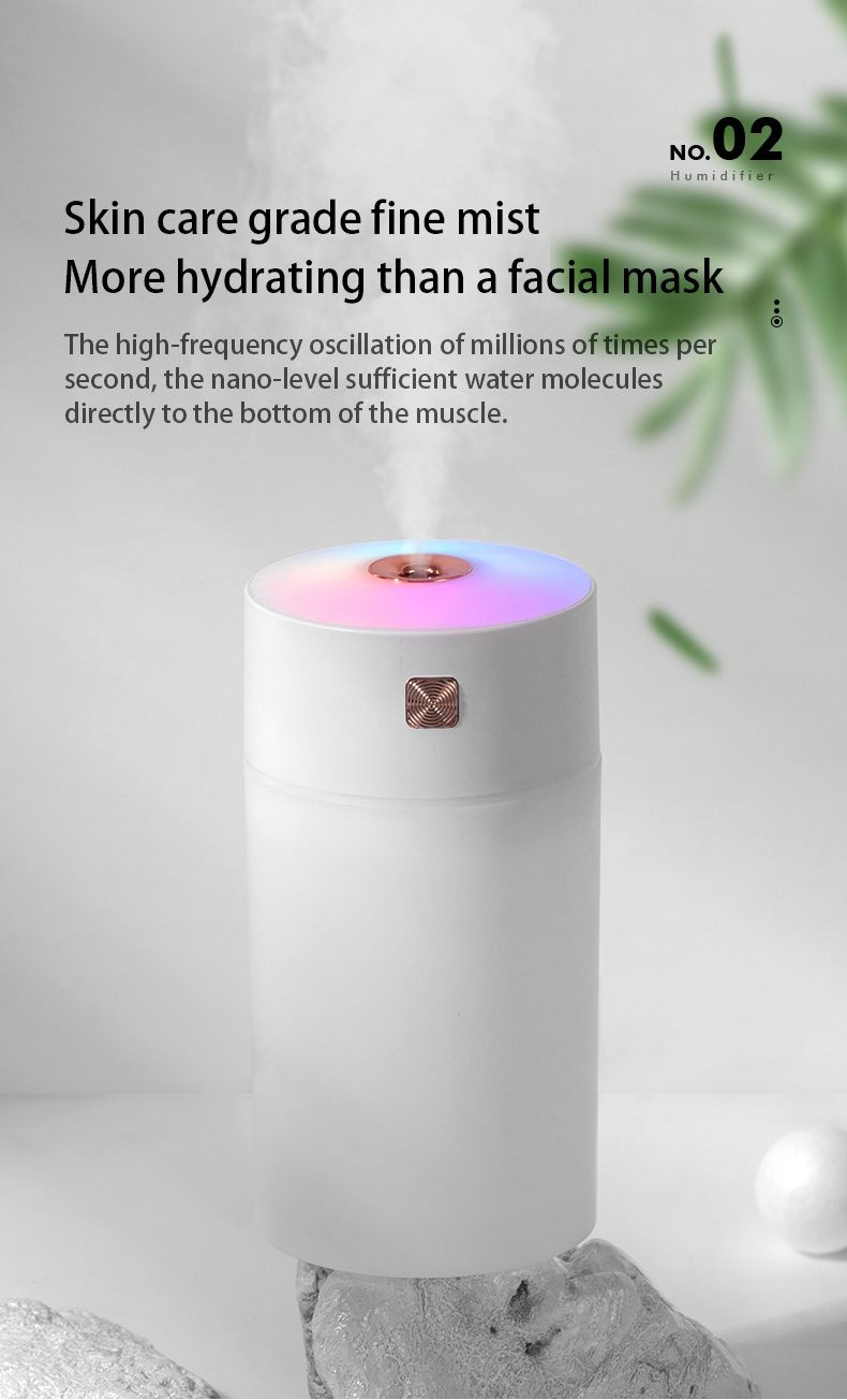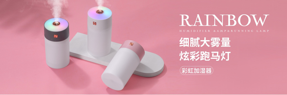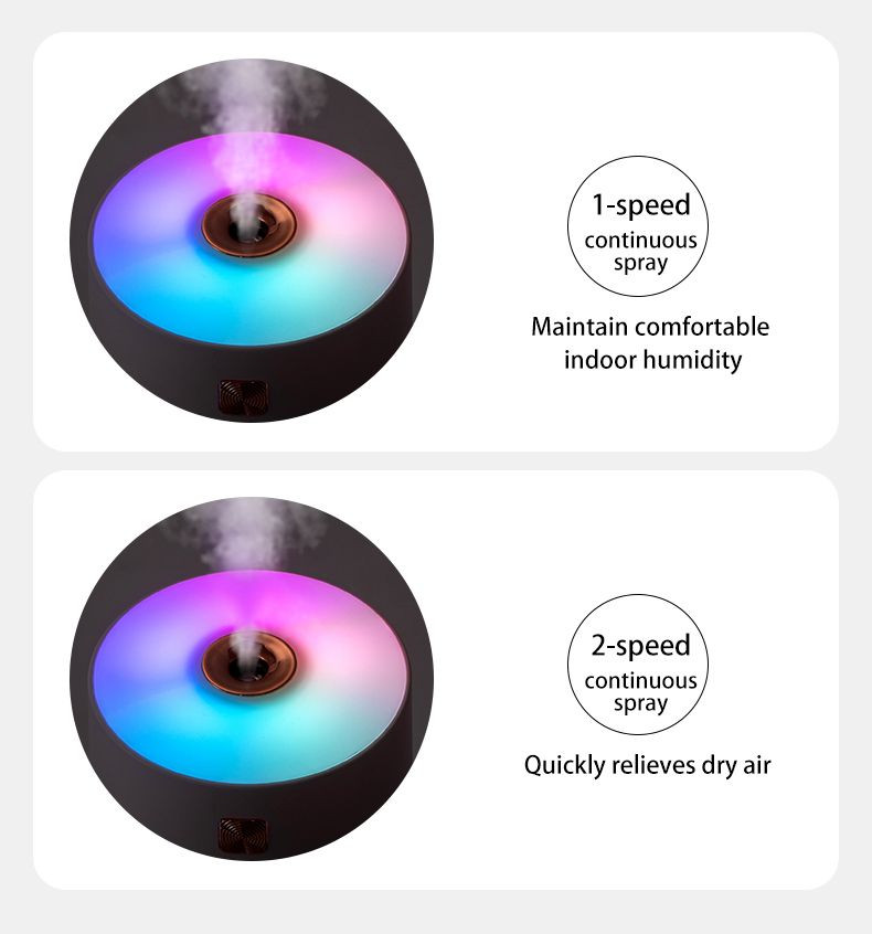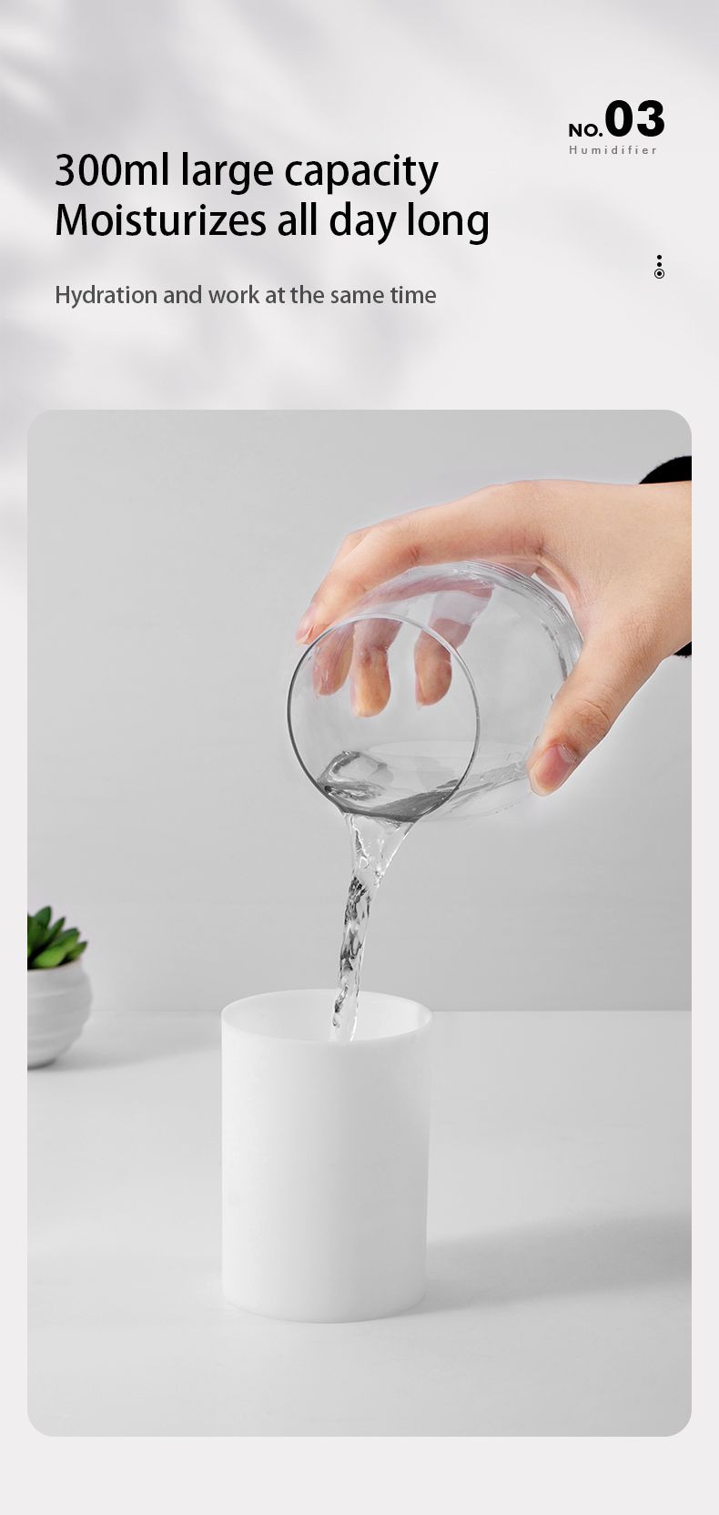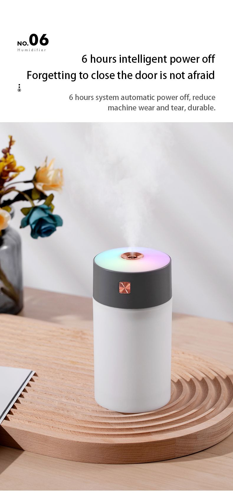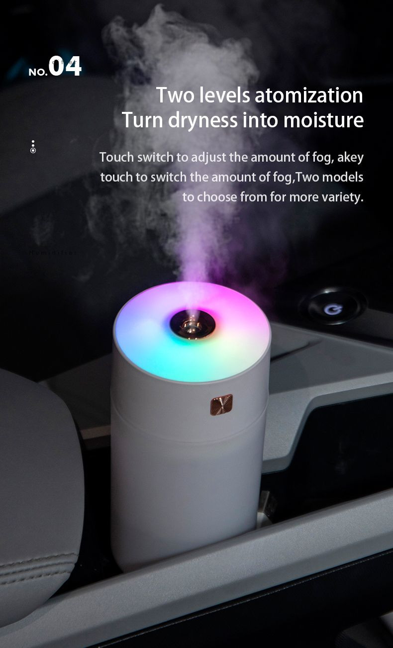 Rainbow Humidifier with 7 color ambient lighting and marquee light function. The noise-reduction design provides silent humidification, with sound levels between 20-30dB during operation. It features a 300ml large water tank with an anti-bacterial design. Two modes are available: 4-hour continuous misting and 6-hour intermittent misting. Compact and convenient, it supports both desktop and car use, improving humidification by 70% in the car. It also has an automatic power-off after 6 hours for safety and convenience.