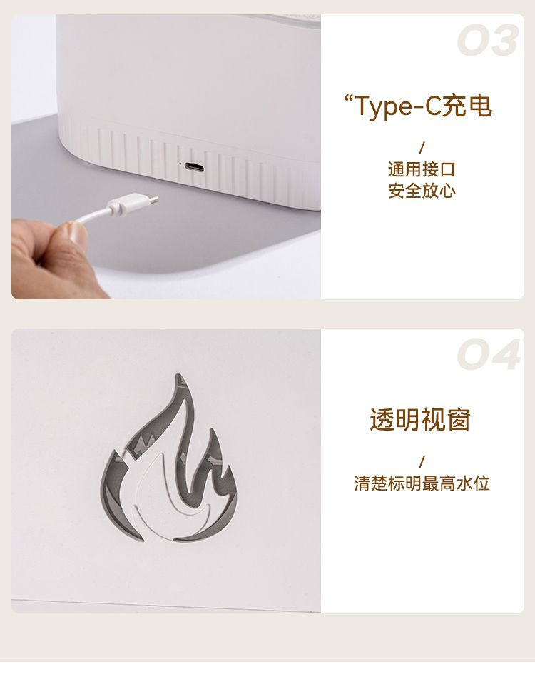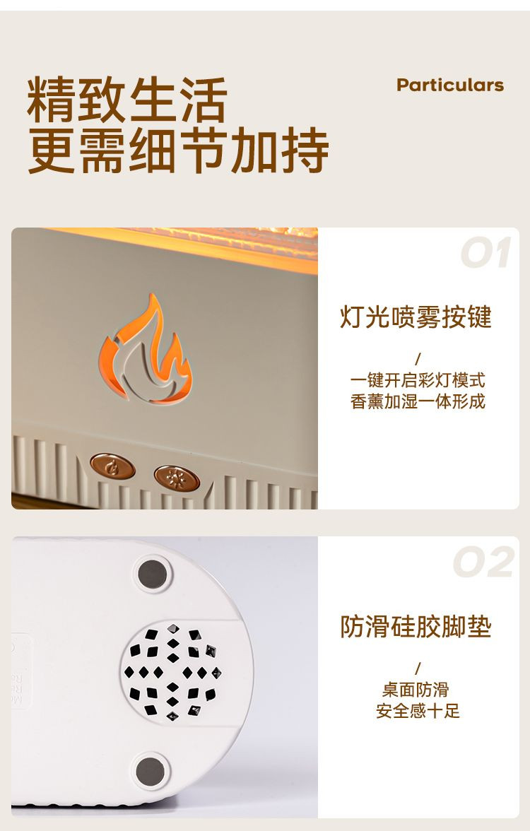 Simulated firewood design creates an immersive atmosphere blending water and fire. Ultrasonic atomization preserves essential oil components, producing fine mist that won’t wet the tabletop. Seven adjustable colors for creative effects. Dual-button control for light and mist. Non-slip silicone feet. Transparent window for easy water level viewing. Automatic power-off when water is low, safe and convenient.